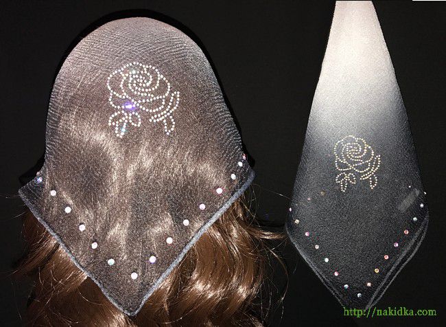| Белая с черным двухтонная косынка с наклеенным блестящим узорoм розочкой и блестящими камешками по краю |