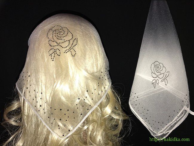| Черная с белым двухтонная косынка с наклеенным серым узорoм розочкой и серыми камешками по краю |