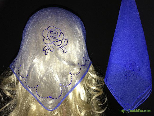 | Синяя нейлоновая косынка с наклеенной синей розочкой и синим волнистым узором на краю |