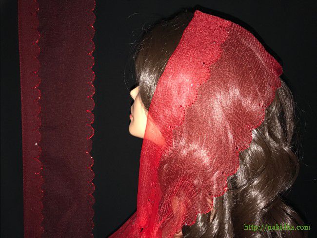 | Красный нейлоновый шарф с наклеенным красным узором на волнистой кромке |