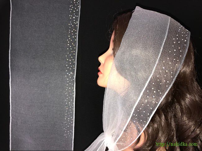 | Утененный серо-белый нейлоновый шарф с наклеенным по краю блестящими камушками |
