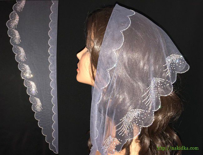 | Серый фатиновый треугольный шарф с волнистым ободком и наклеенным по его контуру блестящими узорами |