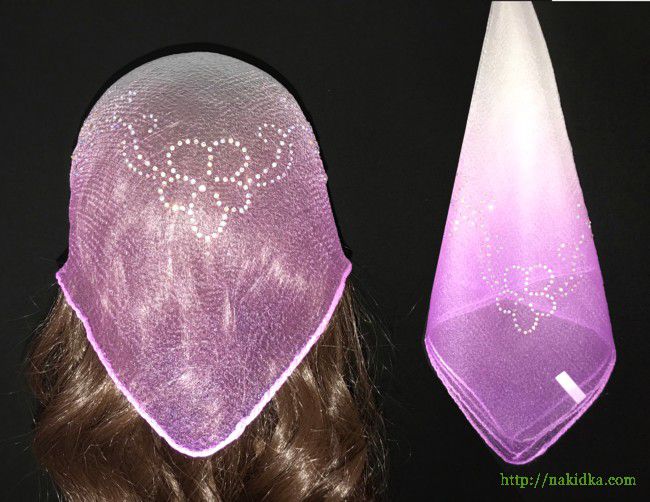 | Белая со светло-фиолетовым двухтонная нейлоновая косынка с наклеенным блестящим узором |