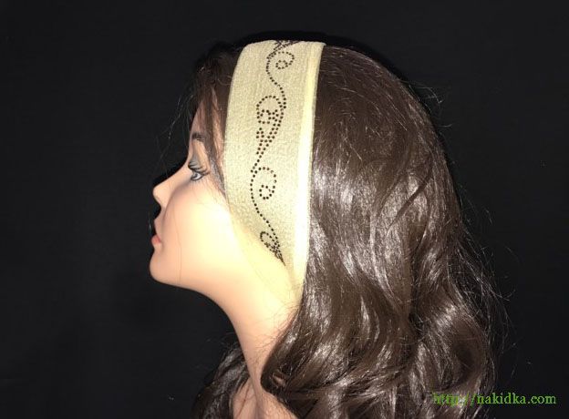 | Бежевый однотонный нейлоновый шарф-полоска с наклеенным коричневыми камушками |