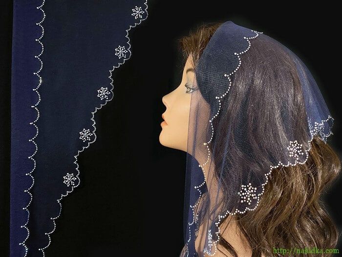 | Темно-синий фатиновый треугольный шарф с волнистым ободком и наклеенным по его контуру блестящими узорами |