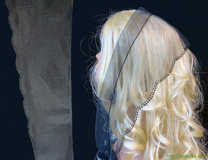 | Черный фатиновый треугольный шарф с волнистым ободком и наклеенным черным узором |