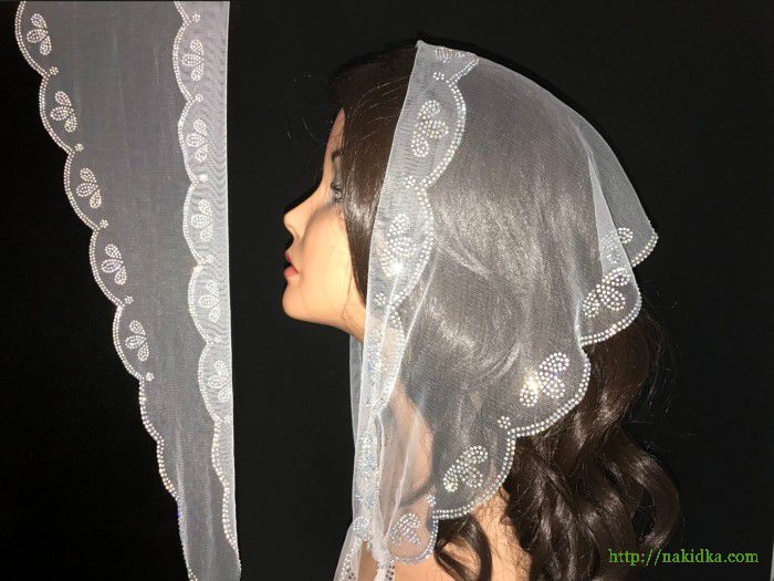 | Белый фатиновый треугольный шарф с наклеенными блестящими камушками, волнистыми ободками и наклеенным по их контурам блестящими узорами |