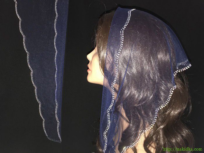 | Темно-синий фатиновый треугольный шарф с волнистым ободком и наклеенным по его контуру блестящим узором |