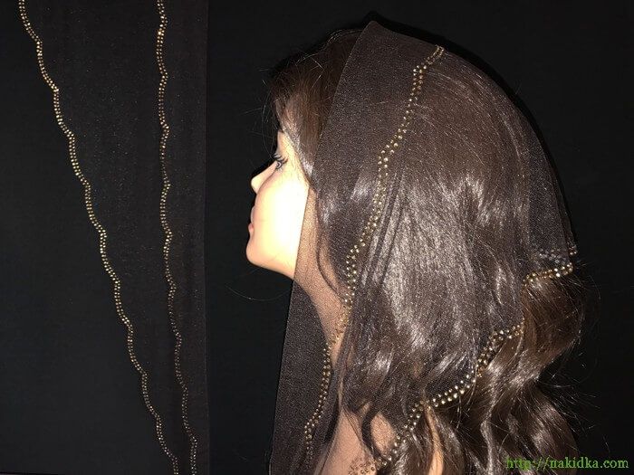 | Темно-коричневый фатиновый треугольный шарф с волнистым ободком и наклеенным по его контуру золотистым узором |