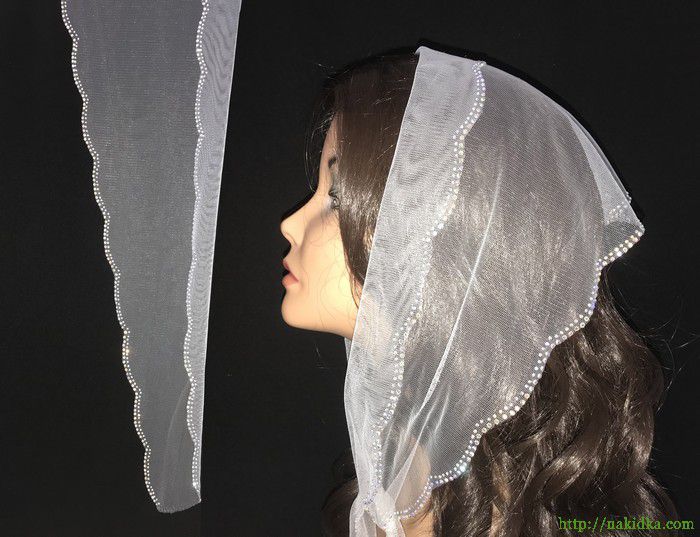 | Белый фатиновый треугольный шарф с наклеенными блестящими камушками, волнистым ободком и наклеенным по его контуру блестящими узорами |