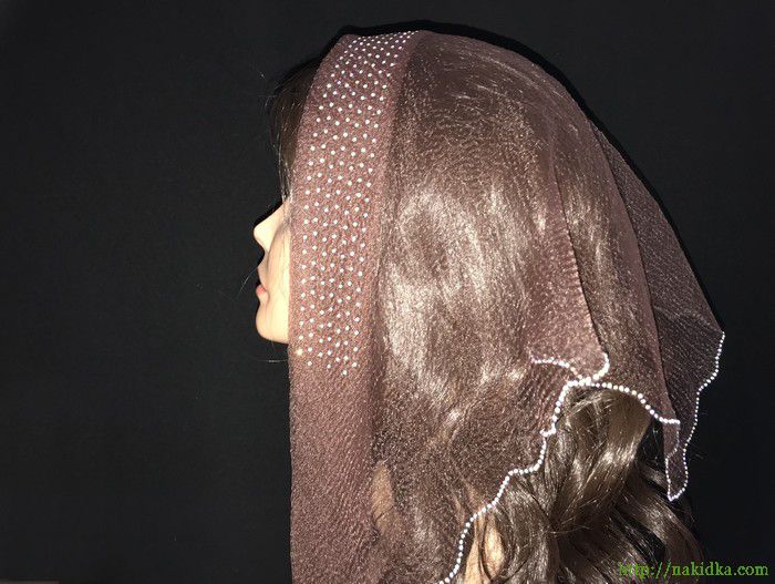 | Темно-коричневая однотонная косынка с блестящими узорами на подвернутом крае и на волнистом ободке |