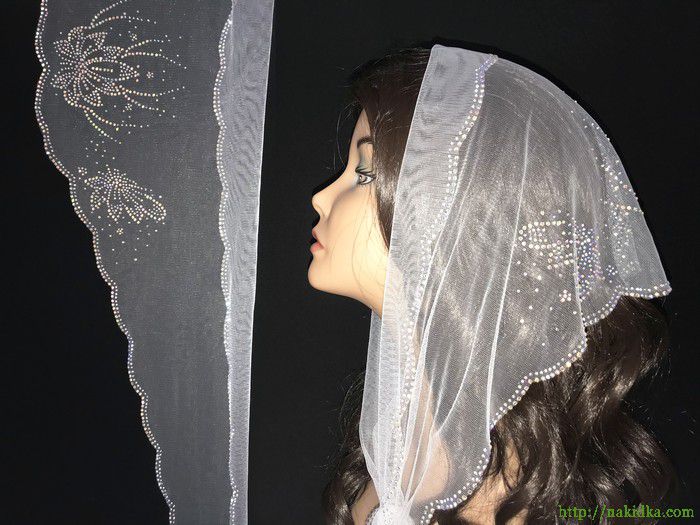 | Белый фатиновый треугольный шарф с наклеенным блестящим узором, волнистым ободком и наклеенным по его контуру блестящими узорами |
