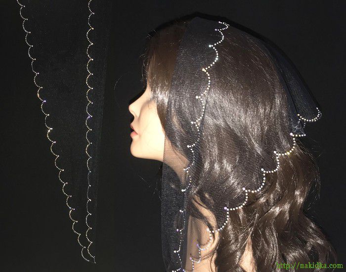 | Черный фатиновый треугольный шарф с волнистым ободком, наклеенным по его контуру блестящим узором |