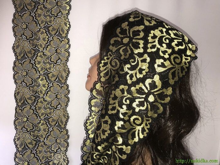 : Золотистый с черным стрейчевый гипюровый шарф с узором