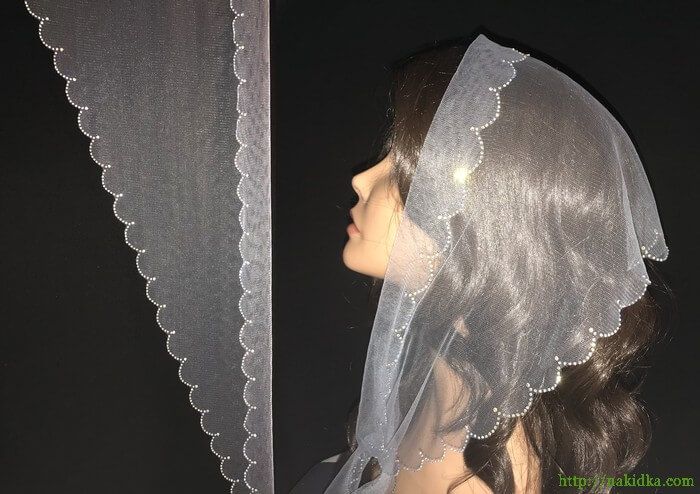 | Серый фатиновый треугольный шарф с волнистым ободком и наклеенным по его контуру блестящими узорами |