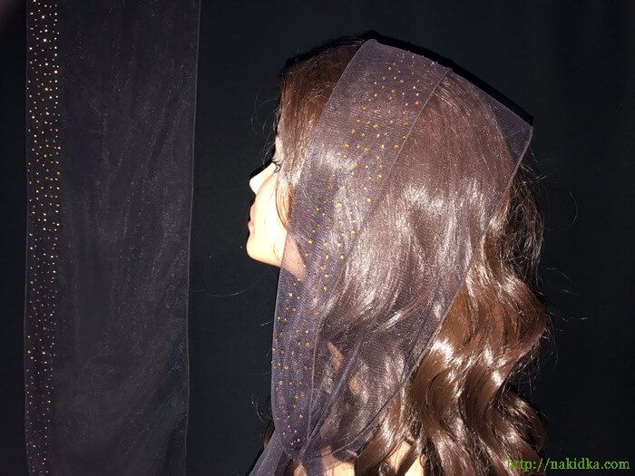 | Темно-коричневый легкий фатиновый шарф с наклеенными золотистыми камушками |