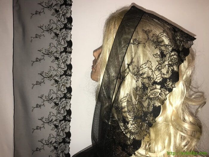 | Черный фатиновый шарф с вышитым узором и волнистым ободком |