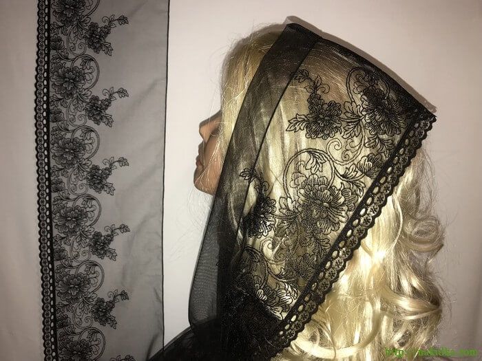 | Черный фатиновый шарф с вышитым узором и кружевом на одном ободке |