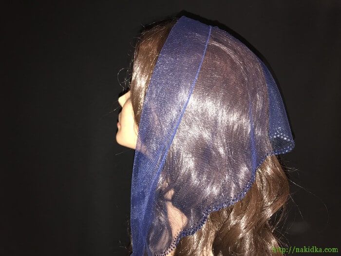 | Синий фатиновый треугольный шарф с наклееными синими камушками на одном ободке |