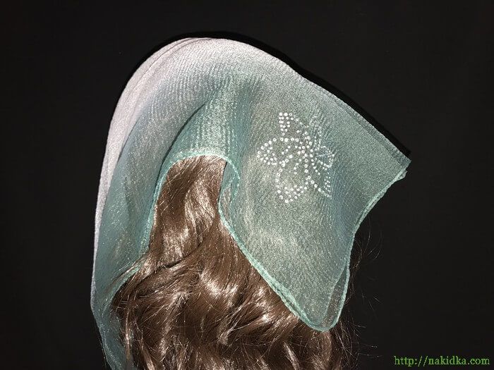 | Белая с серо-зеленым двутонная нейлоновая косынка с наклееным блестящим узором |
