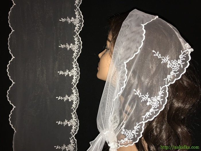 | Белый легкий фатиновый шарф с белым вышитым узором на обоих кромках |