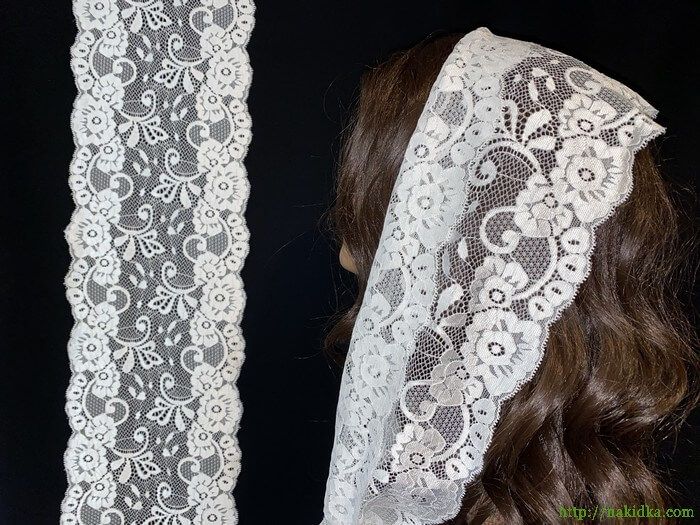 | Белый гипюровый шарф с белыми розами и черным ободком и рисунком |
