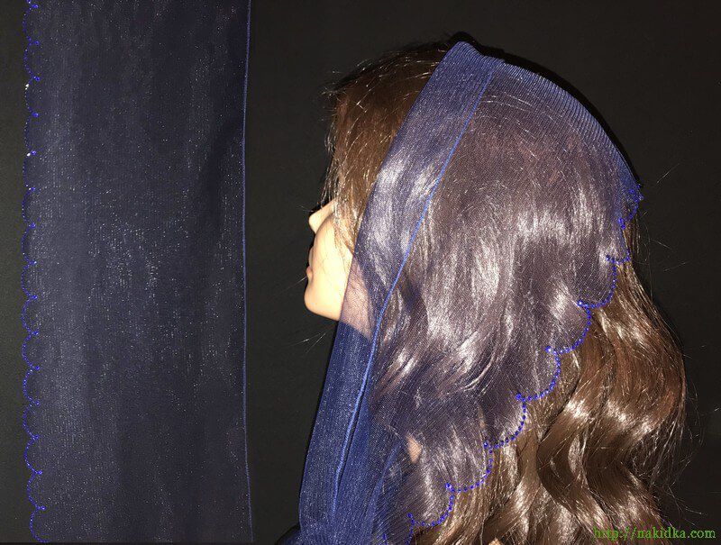 | Темно-синий легкий фатиновый шарф с наклееными синими камушками на волнистом ободке |