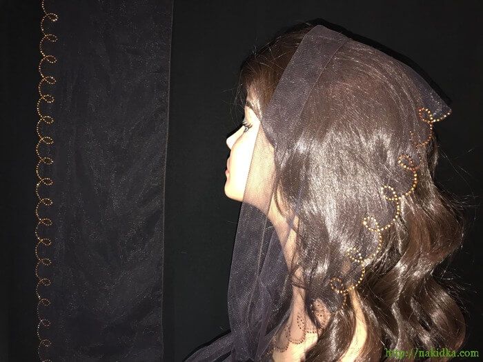 | Темно-коричневый легкий фатиновый шарф с наклеенным золотистым узором по ободку |