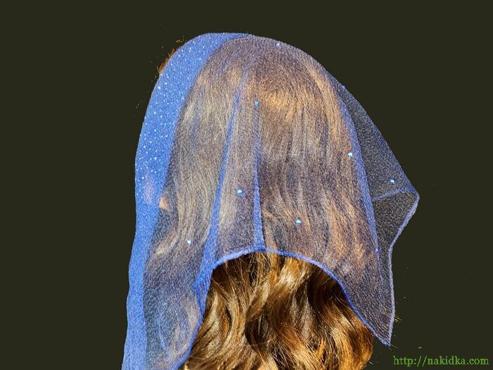 | Синяя однотонная нейлоновая косынка с подвернутым и проклееным ободком и наклееными на нем и сзади на косынке синими камушками |