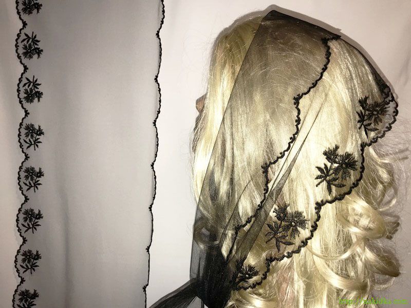 | Черный легкий фатиновый шарф с черным вышитым узором на обоих кромках |