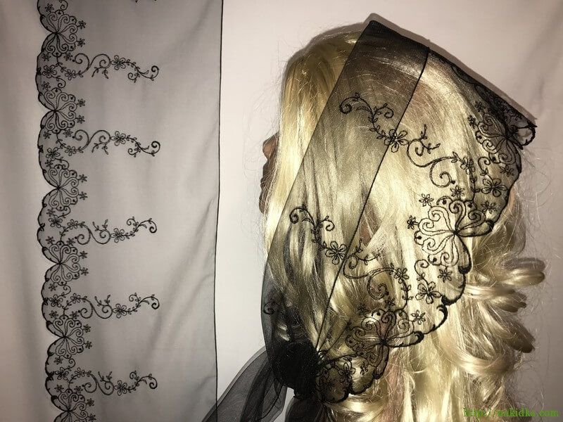 | Черный легкий фатиновый шарф с черным вышитым узором на одной кромке |