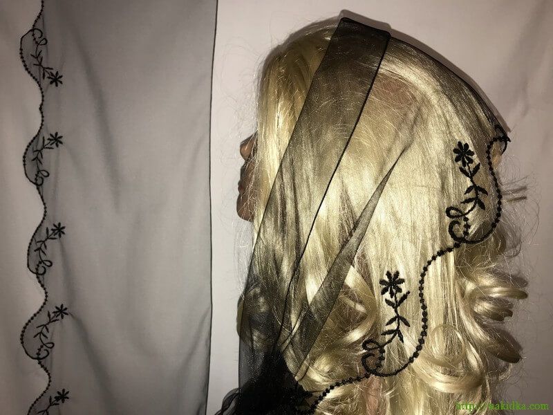 | Черный легкий фатиновый шарф с черным вышитым узором на одной кромке |