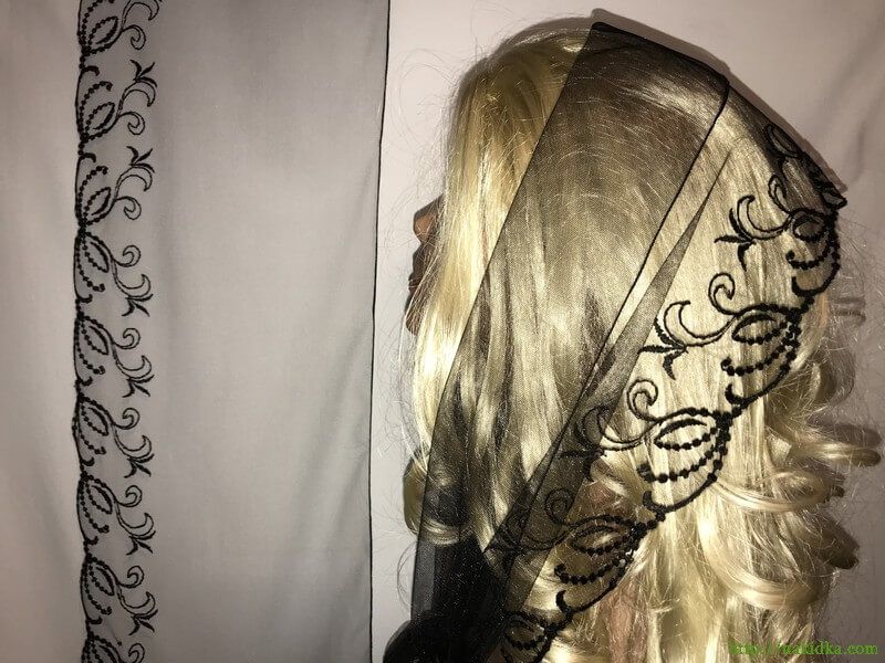 | Черный легкий фатиновый шарф с черным вышитым узором на одной кромке |