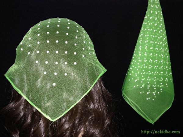 Салатовая нейлоновая косынка в мелкий белый горошек