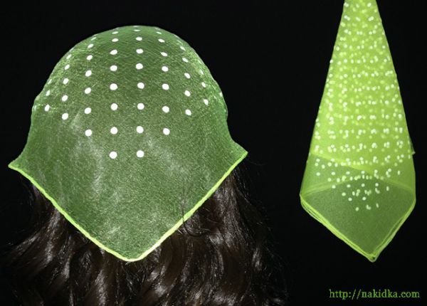Светло-салатовая нейлоновая косынка в мелкий белый горошек