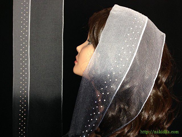 | Утененный узкий бело-черный нейлоновый шарф с наклееными блестящими камушками |