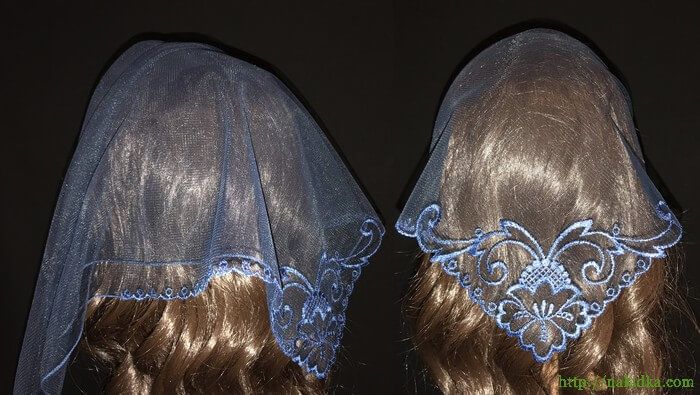 | Темно-синяя легкая фатиновая косынка с синим вышитым узором |