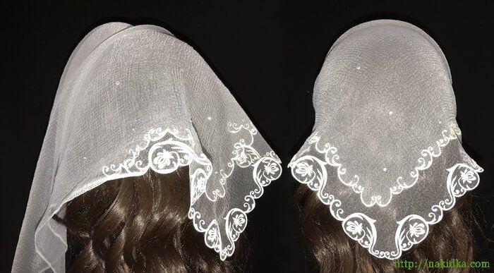 | Белая однотонная нейлоновая косынка с наклеенными белым флоковым узором и блестящими камушками |