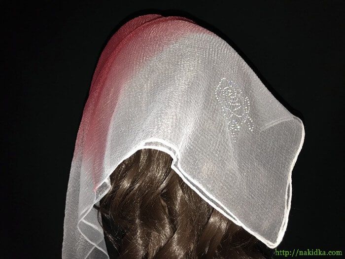 | Белая с красным двутонная косынка с наклеенным блестящим узорoм розочкой |