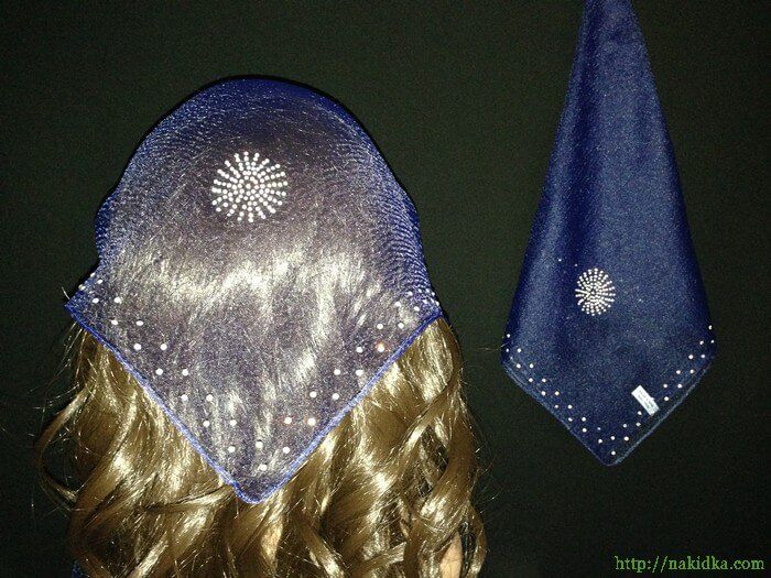| Темно-синяя однотонная нейлоновая косынка с наклееными блестящими узорами |
