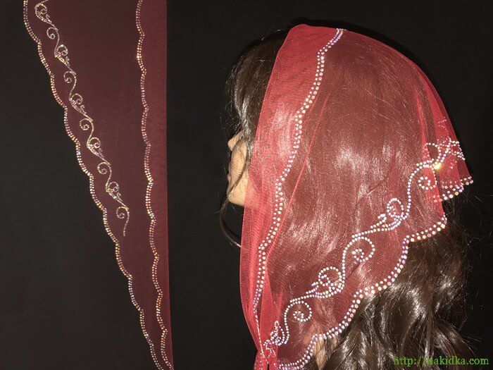 | Красный фатиновый треугольный шарф с наклеенным блестящим узором, волнистым ободком и наклеенным по его контуру блестящими узорами |