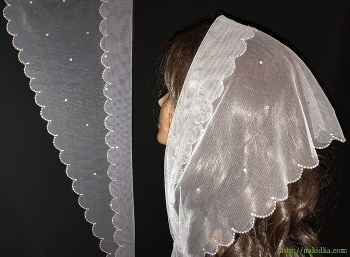 | Белый фатиновый треугольный шарф с наклеенными блестящими камушками, волнистым ободком и наклеенным по его контуру блестящими узорами |