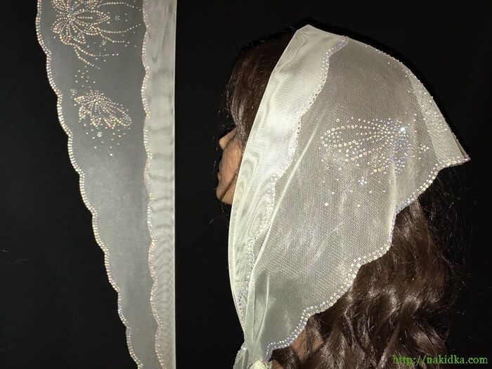 | Светло-салатовый фатиновый треугольный шарф с волнистым ободком и наклеенным по его контуру блестящими узорами |