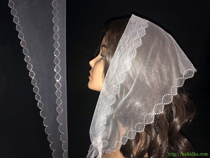 | Белый фатиновый треугольный шарф с наклеенным блестящим узором, волнистым ободком и наклеенным по его контуру блестящими узорами |