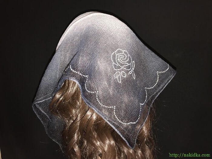 | Белая с черным двутонная косынка с наклеенным блестящим узорoм розочкой и блестящим волнистым узором по краю |