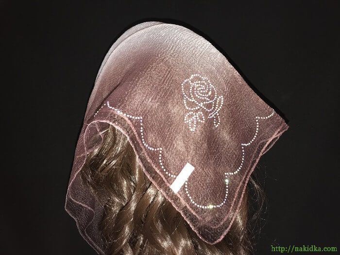 | Белая с коричневым двутонная косынка с наклеенным блестящим узорoм розочкой и блестящим волнистым узором по краю |