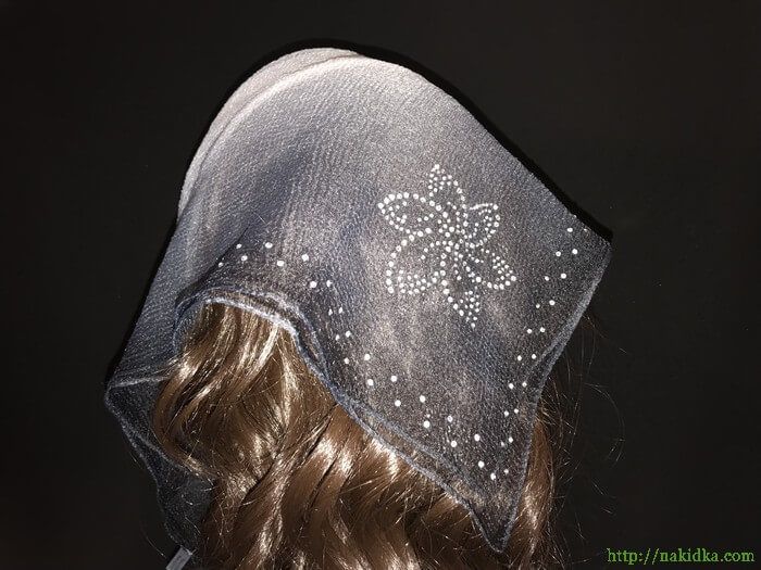 | Белая с черным нейлоновая косынка с наклееным блестящим узором и камушками по ободку |