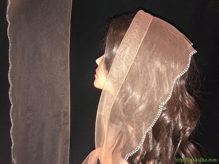 | Кофейно-коричневый легкий фатиновый шарф с наклеенным блестящим узором и вырезанным ободком |