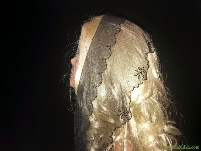 | Черный легкий фатиновый шарф с наклеенными черными узорами на вырезанных ободках |