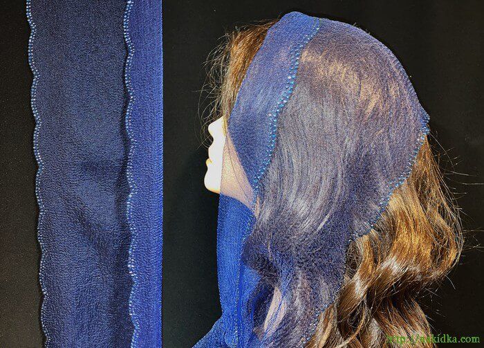 | Темно-синий нейлоновый шарф с наклееными по краю блестящими камушками и волнистой кромкой |